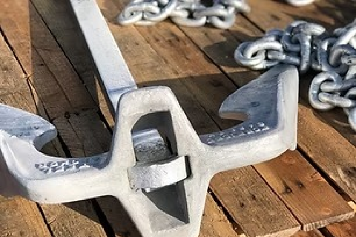 Marine accessories including chain, anchors, cleats, and boat trailers.